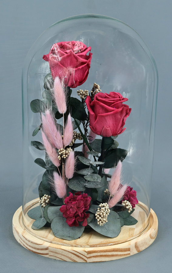 Este diseño exclusivo simboliza vuestro amor protegido, eterno y brillante. Dos rosas, color rosa empolvado,  seleccionadas para representar la magia de vuestro amor.